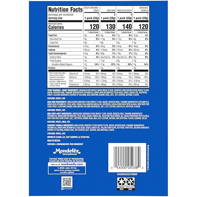 • One 30 count Nabisco Team Favorites Snack Variety Pack, 8 OREO Mini, 8 CHIPS AHOY! Mini, 7 Teddy Grahams, 7 Honey & Barnum’s Animal Crackers (packaging may vary)